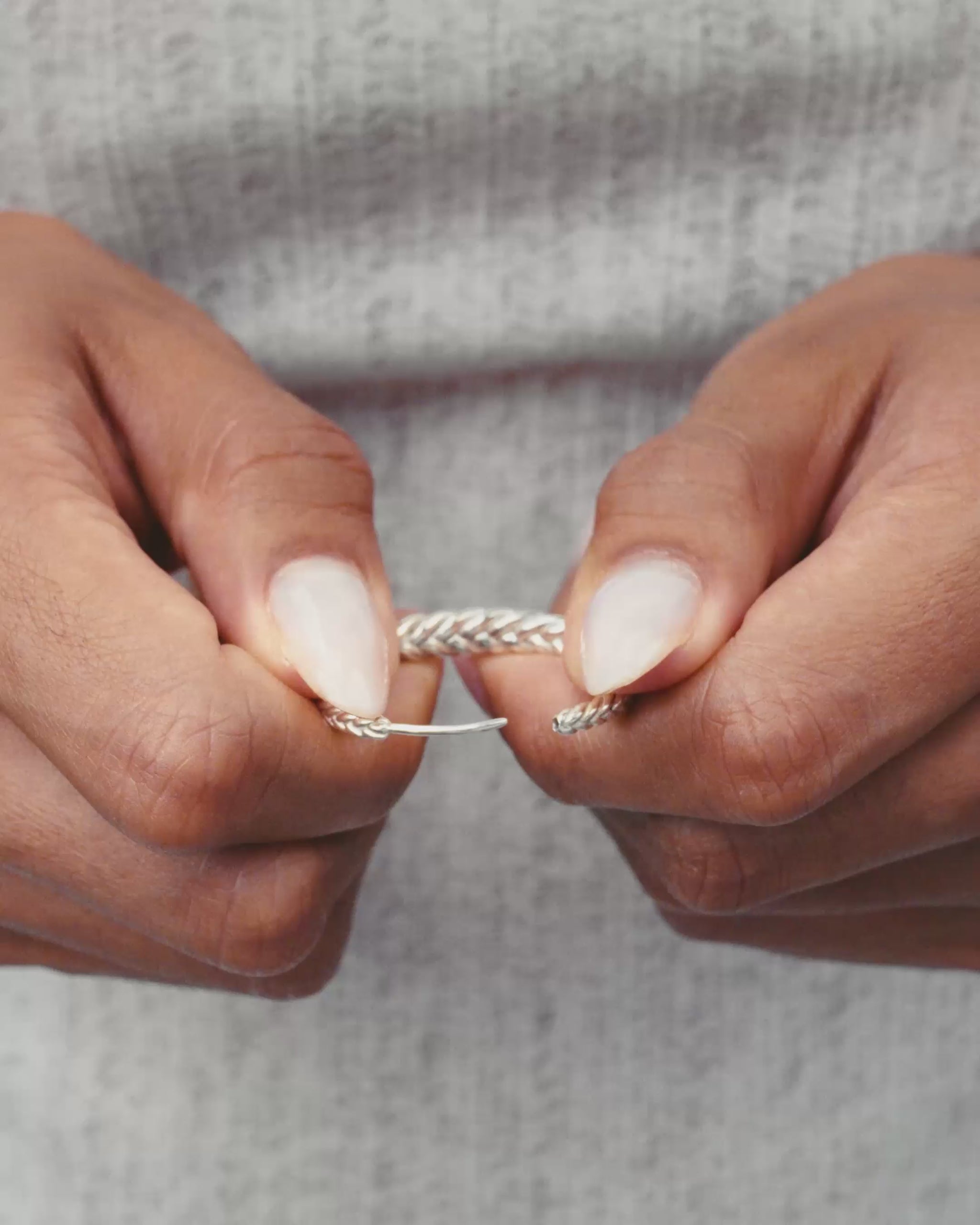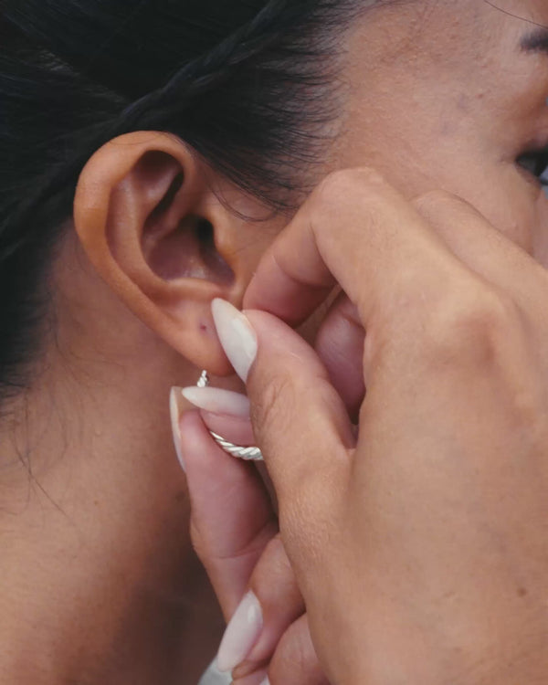 Sterling silver braided hoop earrings, narrowing at the lobe and expanding to their fullest curve at the base. Lightweight and engineered for ease, they open with a gentle flex — designed for your comfort. These essential silver hoops invite play, are easy to pair, stack, and make entirely your own.… Read more