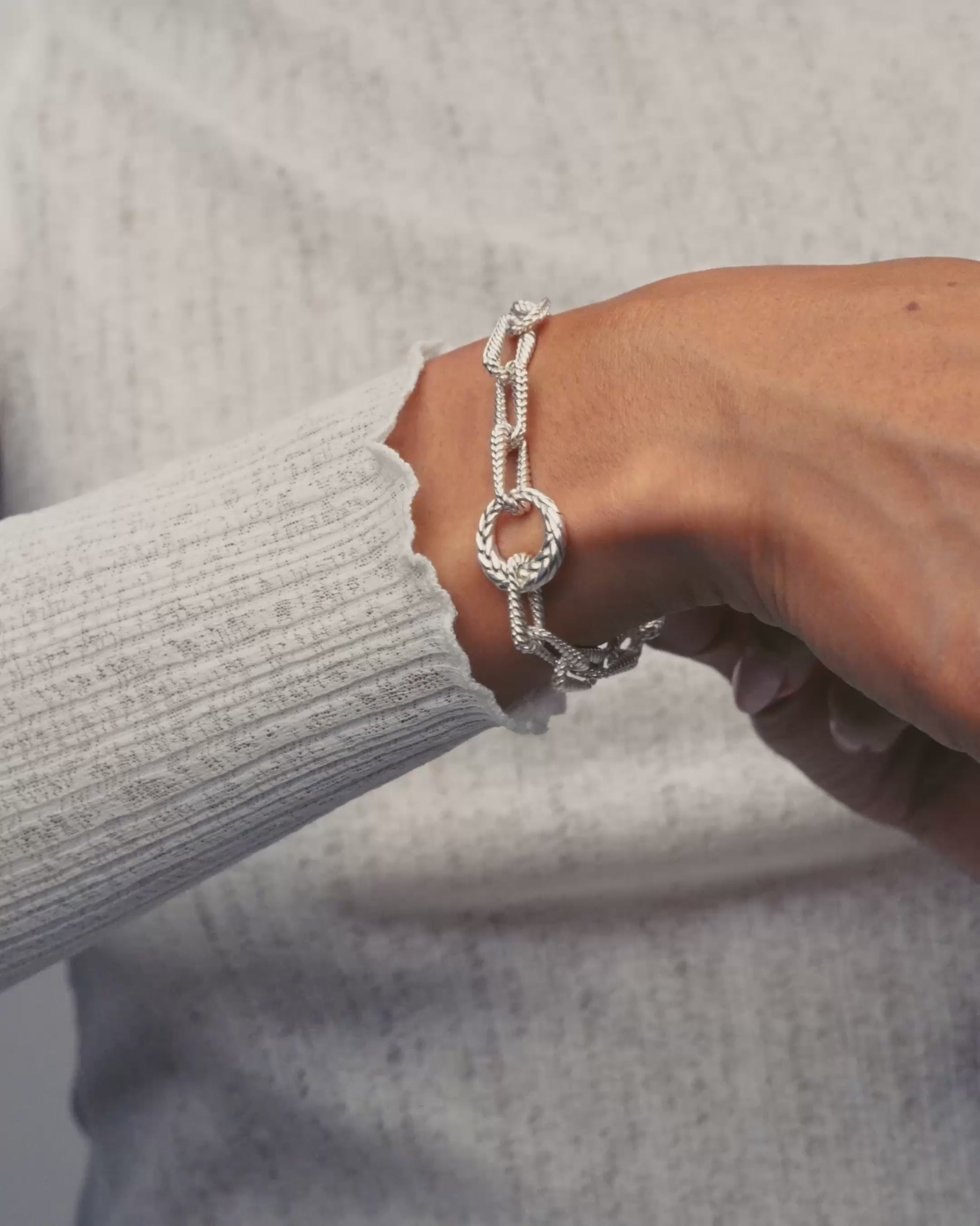 A sterling silver bracelet crafted from tapering braided links — each one hand-carved into beautifully asymmetrical rectangles. Like strands of hair woven by hand, every braid is articulated with integrity. The discreet hinge lock is embedded in the circular wreath closure, making it a feat of functional beauty. Limited edition… Read more