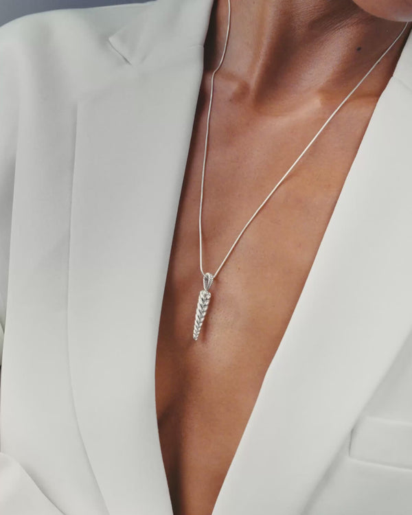 A slender braided ponytail pendant in sterling silver, designed to lie close against your chest. It carries the integrity and life of a real hair braid — supple, yet strong. It sits on a silky snake chain with a braided motif adorning the custom made lobster clasp. Easy to stack… Read more