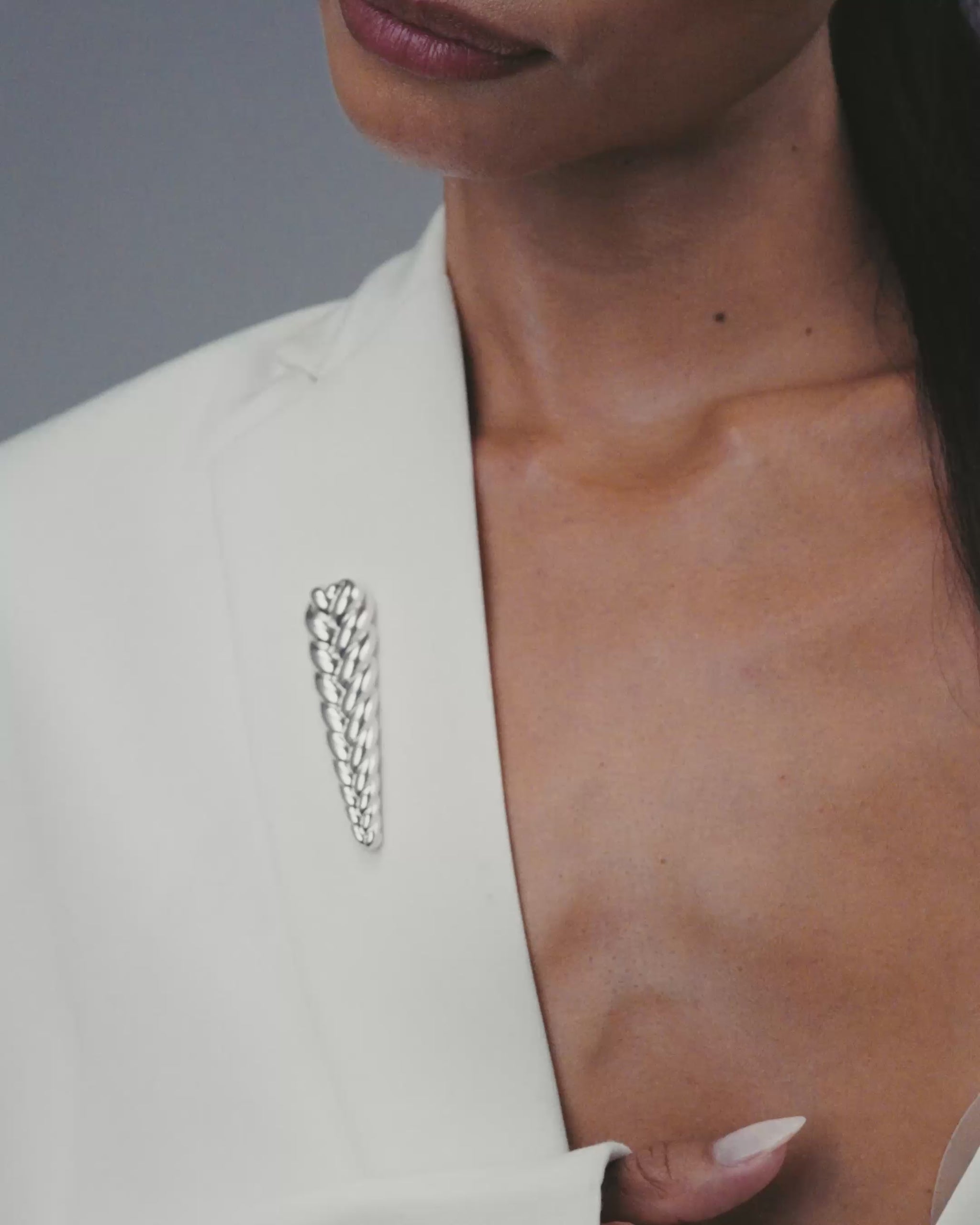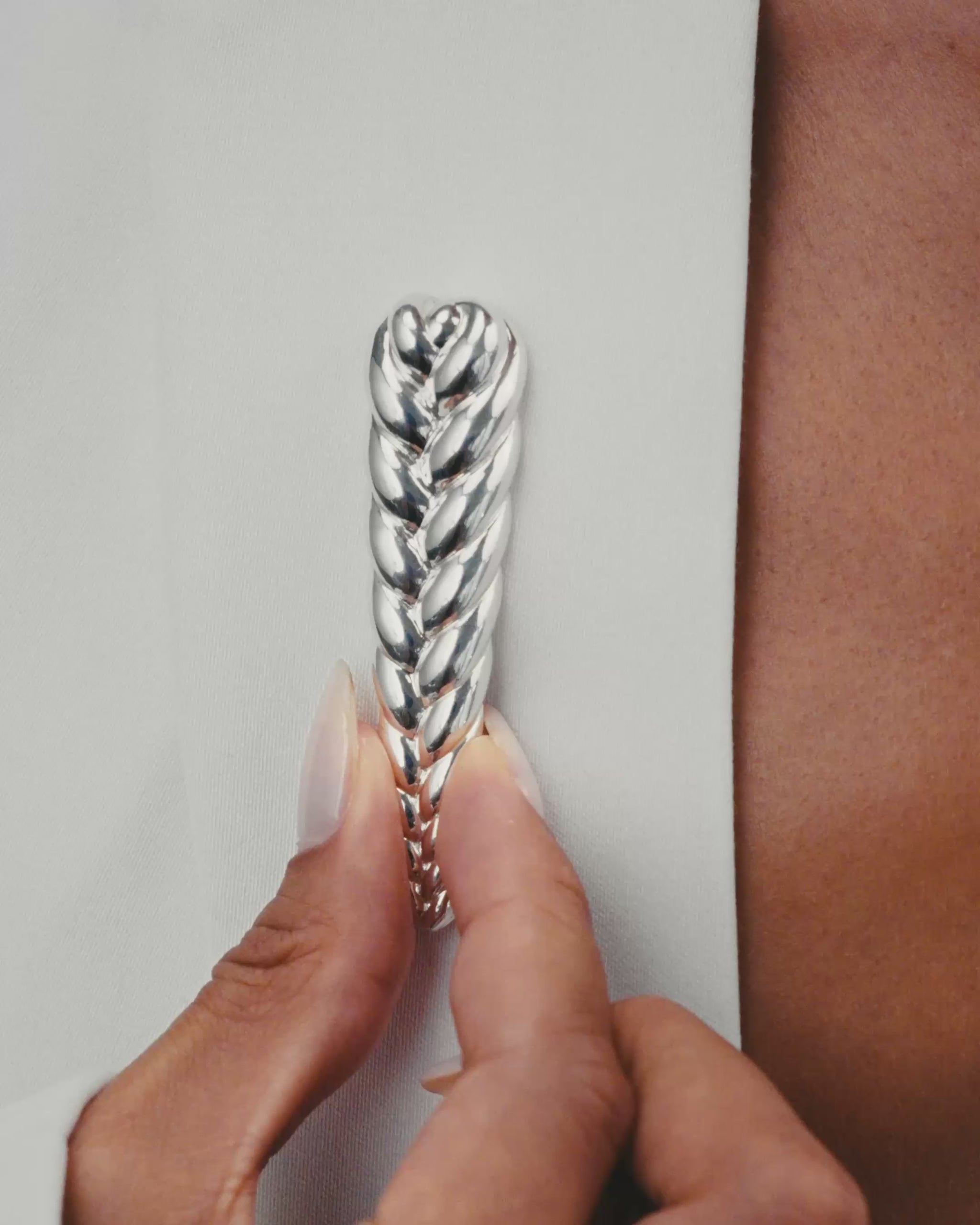 A bold interpretation of our signature brooch design. This emblematic, sterling silver sculpted ponytail brooch is strong yet supple, and lifelike in its essence of real woven hair. Featuring our signature magnetic fastener, it’s easy to wear and rests securely on any fabric, without leaving any holes. Easy to put… Read more