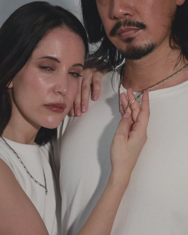 Weathered cylindrical links, crafted in sterling silver, form a 20’’ chain necklace – solid and moving comfortably against the skin. Each link is defined by scars of pressure and time, and some reveal brown and black diamonds embedded within deep chasms. Engineered with a functional push-lock clasp that blends seamlessly into… Read more