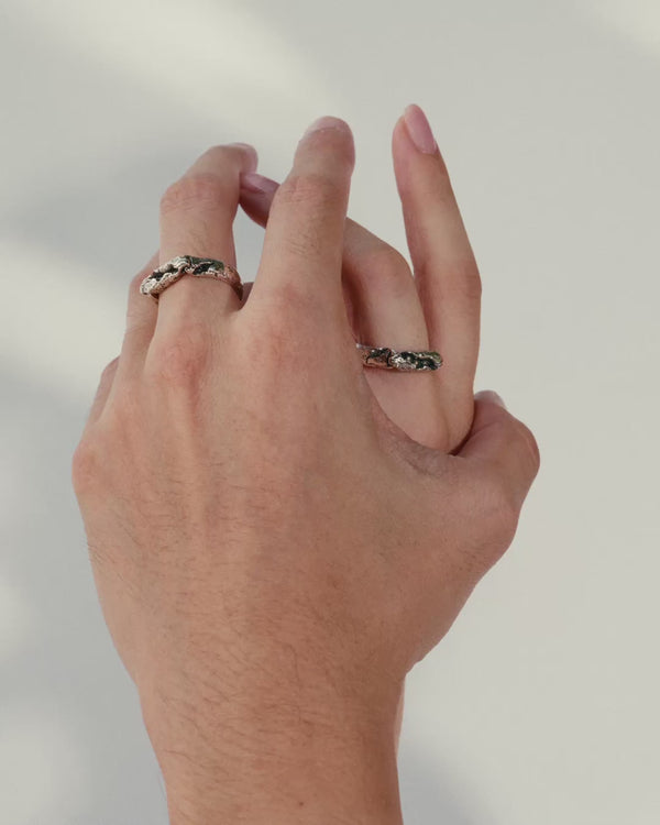 This sterling silver station ring is marked by a fractured plane that sits strongly above the band, fastened securely to the body. A chasm marks the top, revealing brown and black diamonds securely embedded with precision. The underside boasts an organic motif. Limited edition — series of 100. Recycled 925… Read more