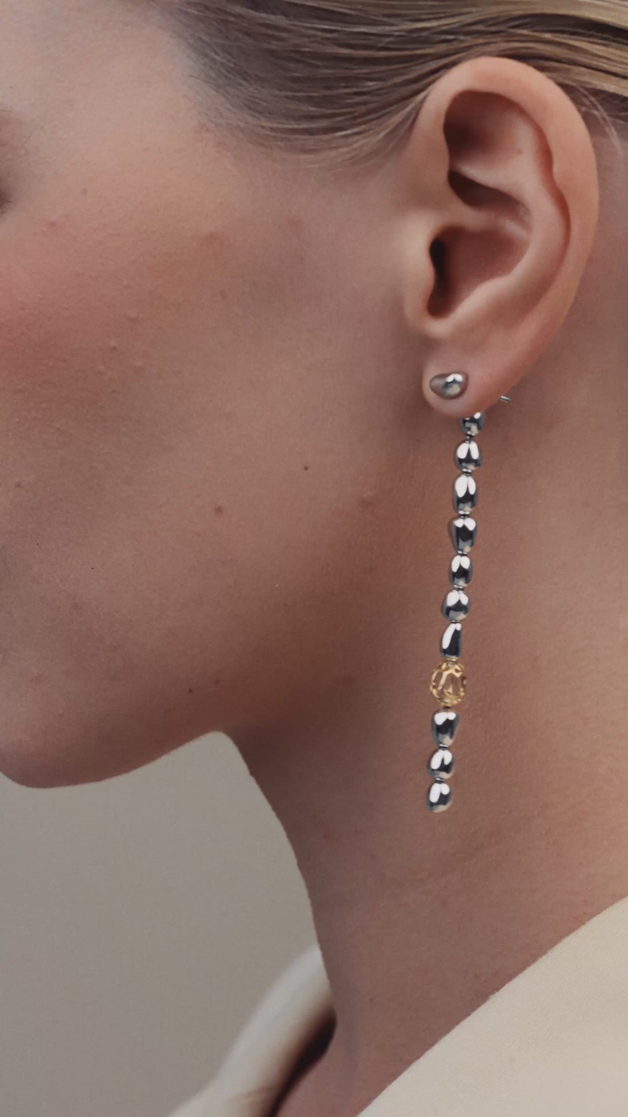 Drop earrings in silver and gold, formed from a vertical sequence of sculptural silver droplets. A latticed gold droplet punctuates the line, bringing in balance and contrast. Voluminous in appearance yet ultralight in wear, the earrings move freely with the body without pulling on the ear. A minimal front stud… Read more
